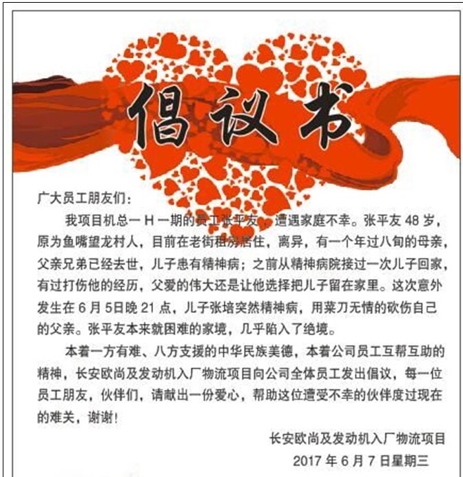 今日上(shàng)午,長安民生(shēng)微信工作(zuò)群傳出一張傳遞溫暖、奉獻愛(ài)心的倡議書(shū)——長安歐尚及發動機入廠物流項目庫管工張友(yǒu)平被患有(yǒu)精神疾病的兒子無情砍傷,左臂刀深十多(duō)公分、左手兩手指幾被砍斷、頭部也被嚴重砍傷,本就經濟困難的他因傷住院現在雪上(shàng)加霜!